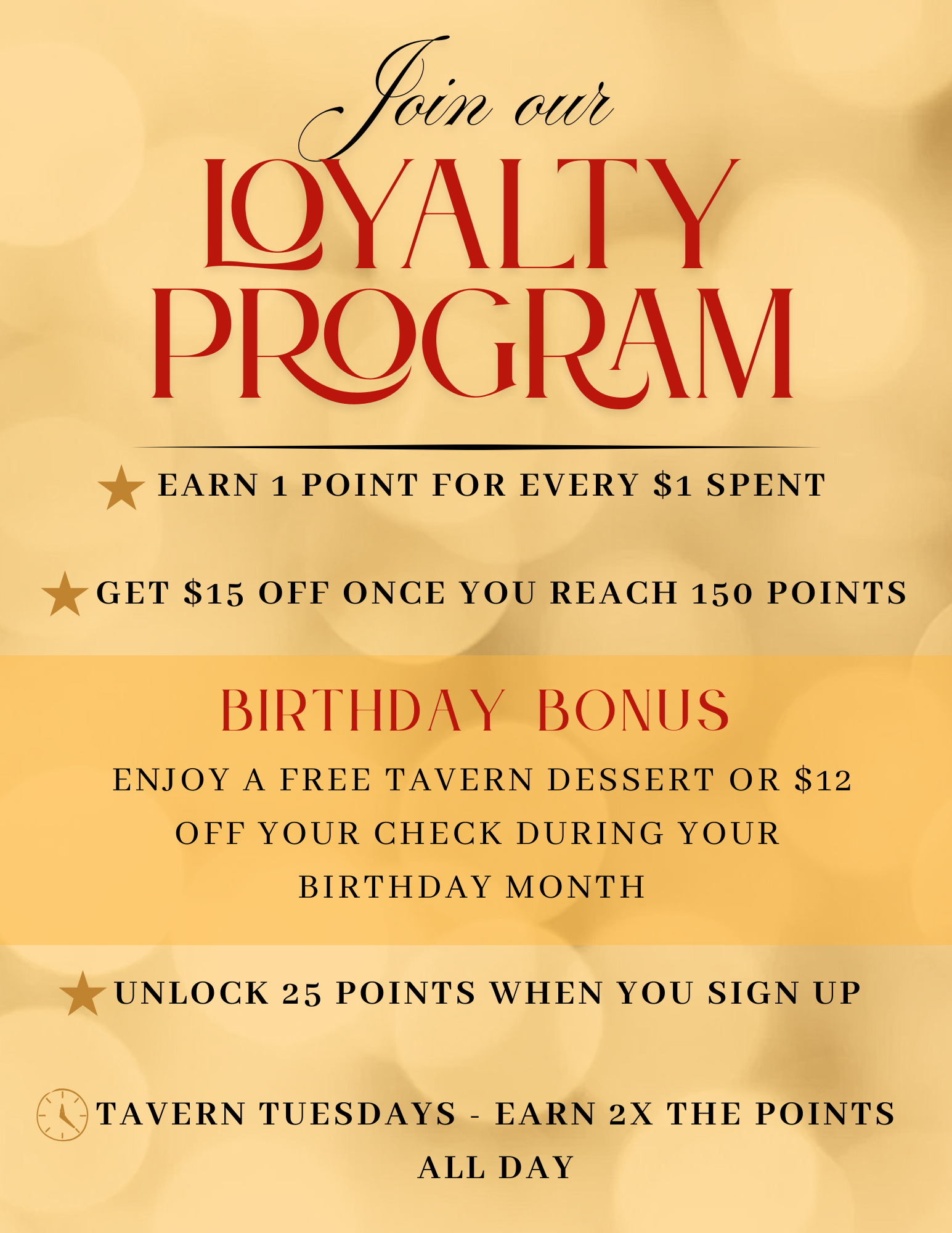 At the Tavern we believe loyalty should be rewarded!! Our Tavern Loyalty Program lets you earn points every time you dine with us - and the best part? Your points never expire!! Start earning today, click HERE to sign up!